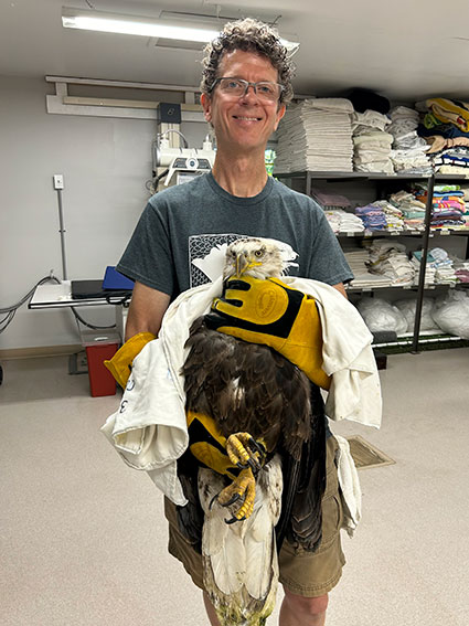 Scott safely holds the Bald Eagle shortly after picking her up and bringing her to the raptor hospital. Why did the rehabilitation process take six months?