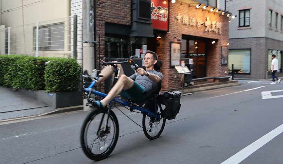 I love cycling and actually brought my recumbent bike from Chicago to Japan. The best thing about the recumbent is that you sit in a comfortable and natural position and can also enjoy the wonderful view of the surroundings. I like to cruise along the Tama River and through Tokyo’s Ginza shopping district.